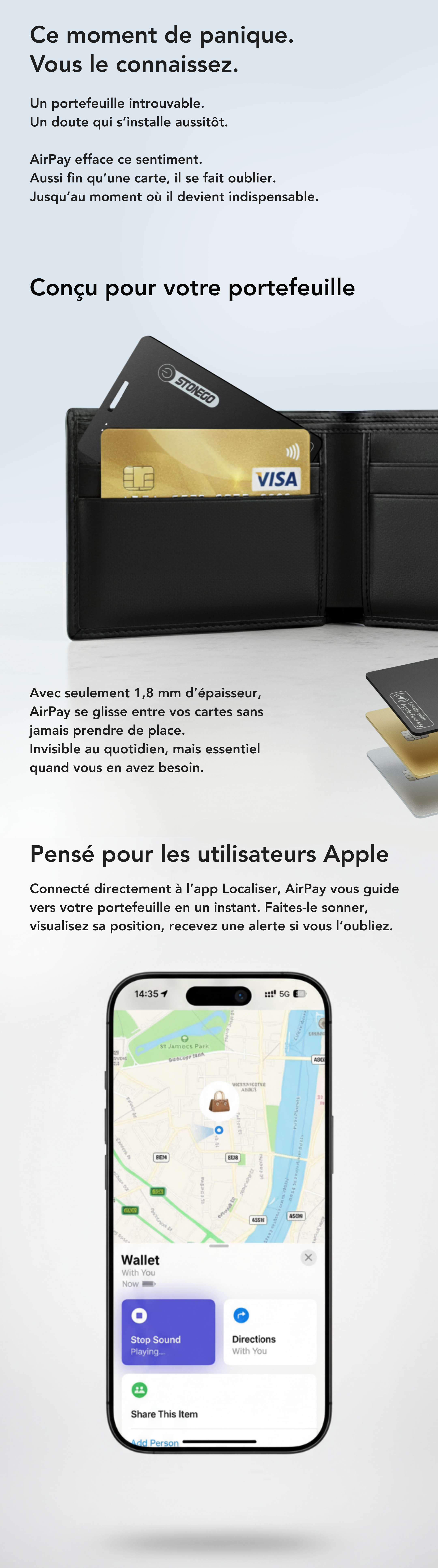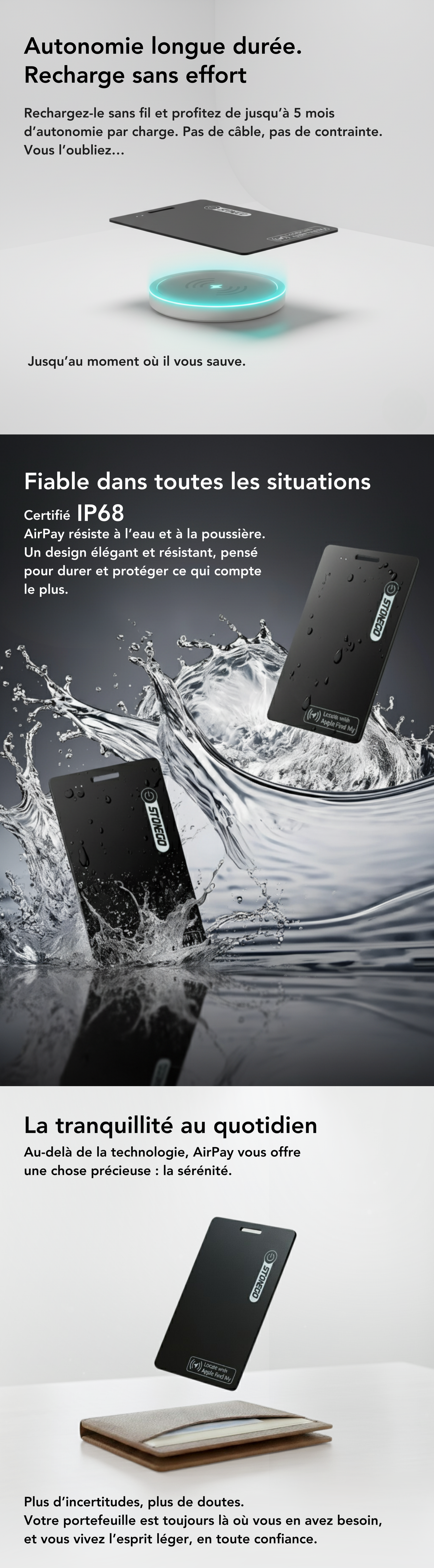 La réponse à toutes ces questions est AirPay. Un produit unique, qui repousse les limites de ce qu’un traceur peut être. Ultra-fin, il se fait oublier dans votre portefeuille. Rechargeable, il accompagne votre quotidien sans interruption. Équipé d’une alarme sonore intégrée, il permet de retrouver vos affaires en quelques secondes. Chaque détail a été pensé pour que la promesse soit tenue : protéger ce qui compte sans rien sacrifier au design.