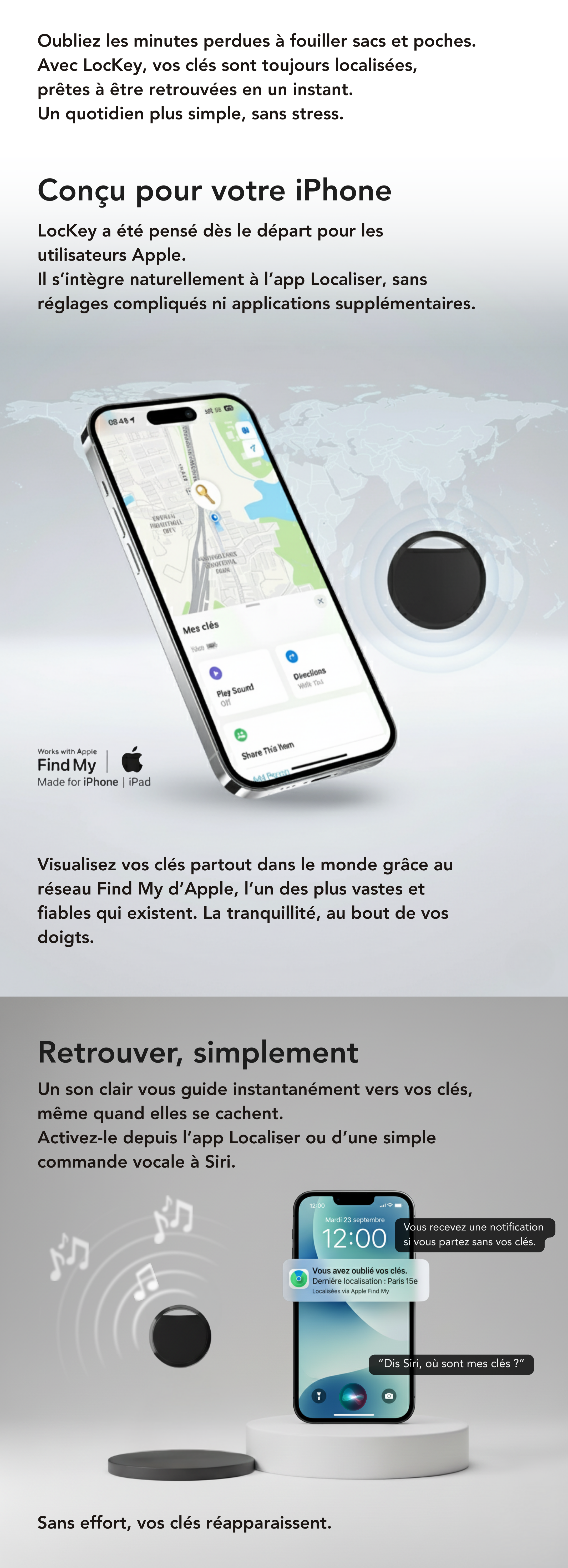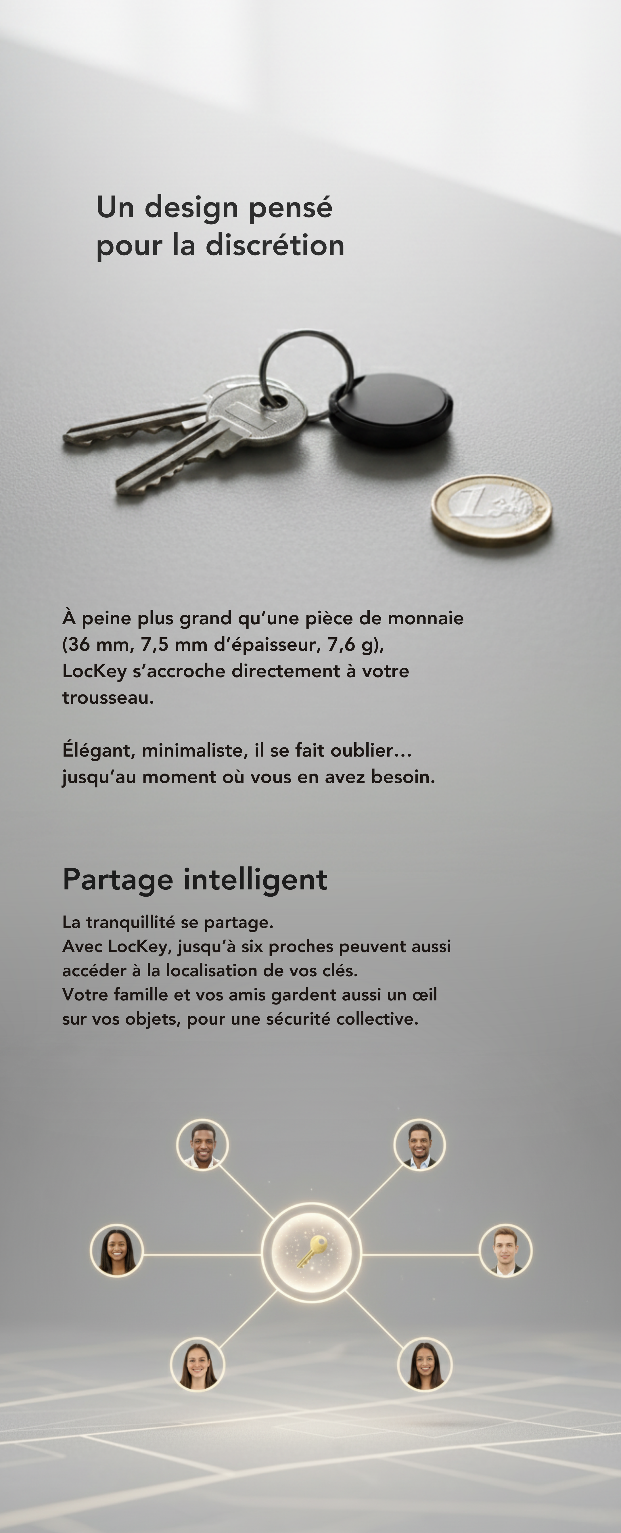 Avec LocKey, notre objectif est simple : que plus personne n’ait à perdre de temps à chercher ses clés, et que chacun puisse profiter d’un produit pensé avec intelligence, honnêteté et exigence. Parce que protéger ce qui compte devrait être une évidence, et non un luxe.