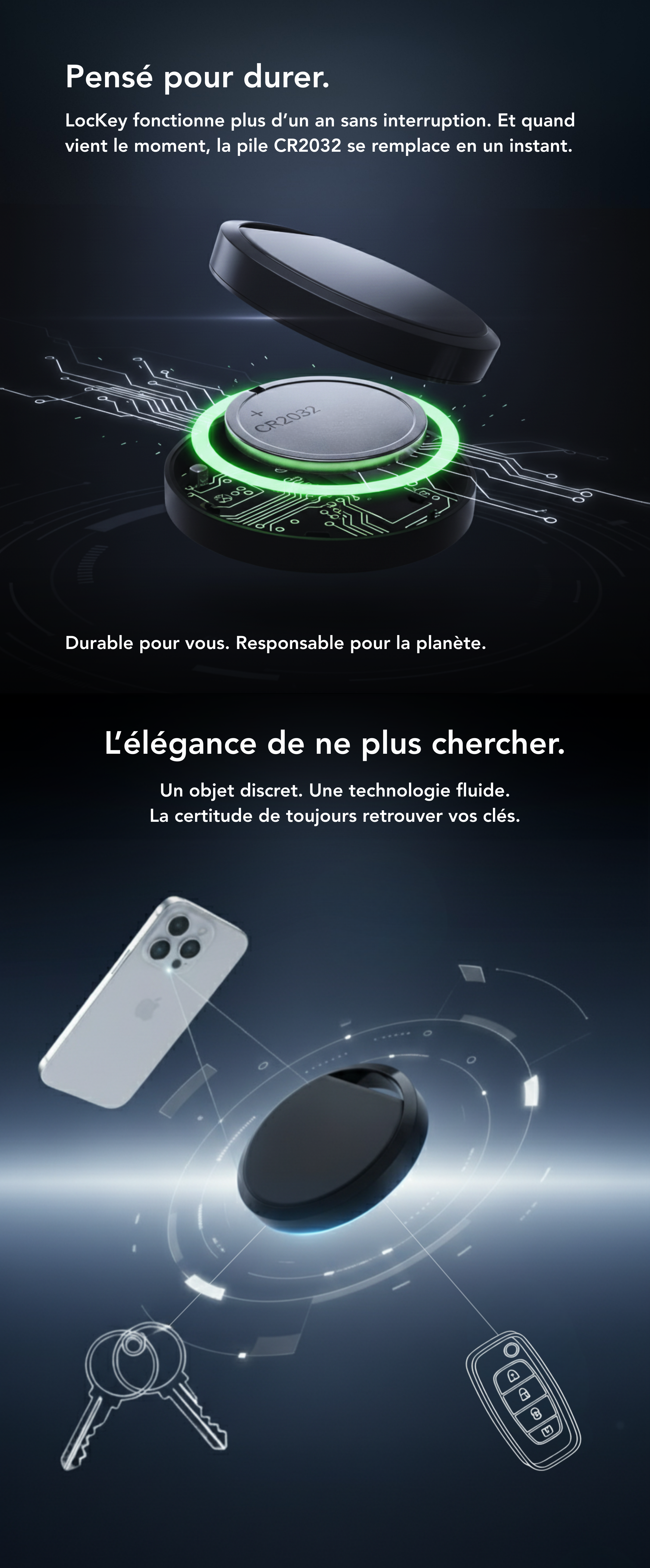 L’idée de LocKey est née d’une observation simple : les clés sont l’objet que nous perdons le plus souvent, et pourtant aucun produit n’avait su répondre à ce problème de manière efficace, accessible et élégant. Nous voulions un traceur qui ne vienne pas alourdir un trousseau, mais qui s’y intègre naturellement, au point de s’y faire oublier.